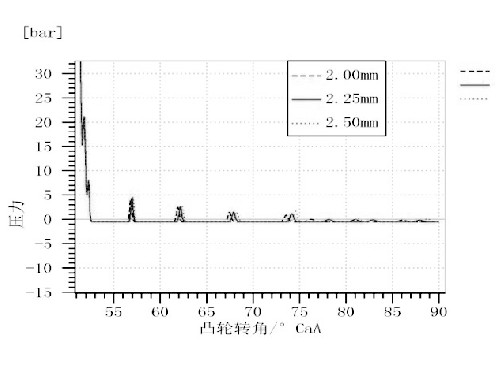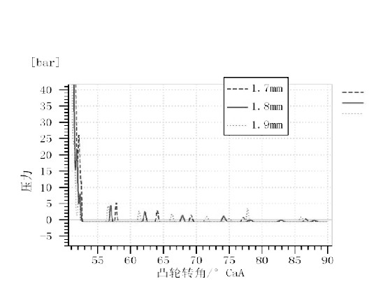 實驗時基本參數(shù)為, 凸輪軸轉速為500r/min, 高壓油管長度0.9m, 油管厚度為2.25mm, 油管直徑1.8mm, 噴孔直徑為0.26mm。首先改變油管長度, 對比參數(shù)為0.8m和1m, 如圖1所示, 隨著管路長度的增大, 殘余壓力波動的波峰明顯增大, 但波長相對較小, 這也決定了管路不能做的太長, 容易導致噴油器的二次噴射;也不能太短, 會造成燃油噴射不穩(wěn)定。其次, 改變高壓油管的厚度, 對比參數(shù)為2mm和2.5mm, 如圖2所示, 由此可發(fā)現(xiàn), 隨著高壓油管厚度的增加, 殘余壓力波的峰值并未改變, 相位延遲, 波長變長, 殘余壓力的衰減也越快;再改變高壓油管的直徑, 對比參數(shù)為1.7mm和1.9mm, 實驗發(fā)現(xiàn), 隨著高壓油管直徑的增加, 波長變短, 波峰下降, 但是存在不規(guī)律波動, 孔徑也不能太小, 否則會使脈動增加, 這是由于隨著孔徑的減小, 產(chǎn)生節(jié)流作用;最后, 改變對噴油特性有顯著影響的噴油嘴的噴孔直徑, 對比參數(shù)為0.28mm和0.24mm, 如圖3、4, 通過實驗對比發(fā)現(xiàn), 隨著噴孔直徑的變化, 殘余壓力也會產(chǎn)生相應變化[3], 噴孔孔徑增加, 殘余壓力波長變小, 但峰值卻相應的增加, 會導致不正常噴射[4], 同時這也是燃油霧化不良的主要因素, 但噴孔直徑過小, 會導致壓力波在管內(nèi)往復傳播的頻率增加, 導致管路不穩(wěn)定, 脈動加劇。