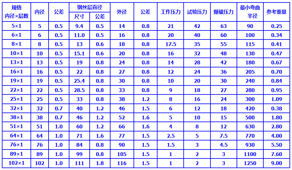 結構:膠管由內膠層,一層鋼絲編織層和外膠層組成
