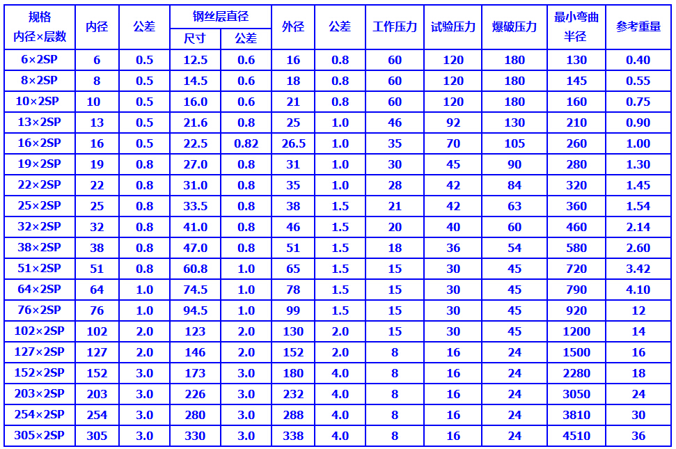 結(jié)構(gòu):膠管由內(nèi)膠層、二層鋼絲纏繞層和外膠層組成